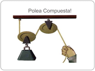 Poleas compuestas: el sistema de poleas compuestas se utiliza con el propósito de alcanzar una amplia ventaja de carácter mecánico, levantando objetos de gran peso con un esfuerzo mínimo. Para su ejecución se emplean poleas fijas y móviles. Con la primera se cambia la dirección de la fuerza a realizar. El sistema de poleas móviles más común es el polipasto.