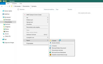 Una vez que estamos en el explorador de archivos de Windows en la ubicación deseada, para crear una carpeta pulsamos con el botón derecho del ratón sobre el panel de la derecha y seleccionamos “Nuevo”, y en el submenú que se despliega seleccionamos “Carpeta”.
